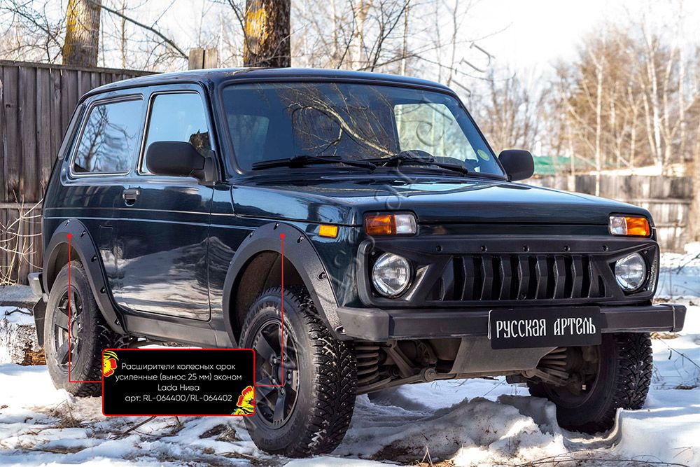 Расширители колёсных арок Русская Артель (25 мм) эконом для ВАЗ Нива 2121, 4x4 I 1977-2026 (Шагрень). Артикул RL-064602